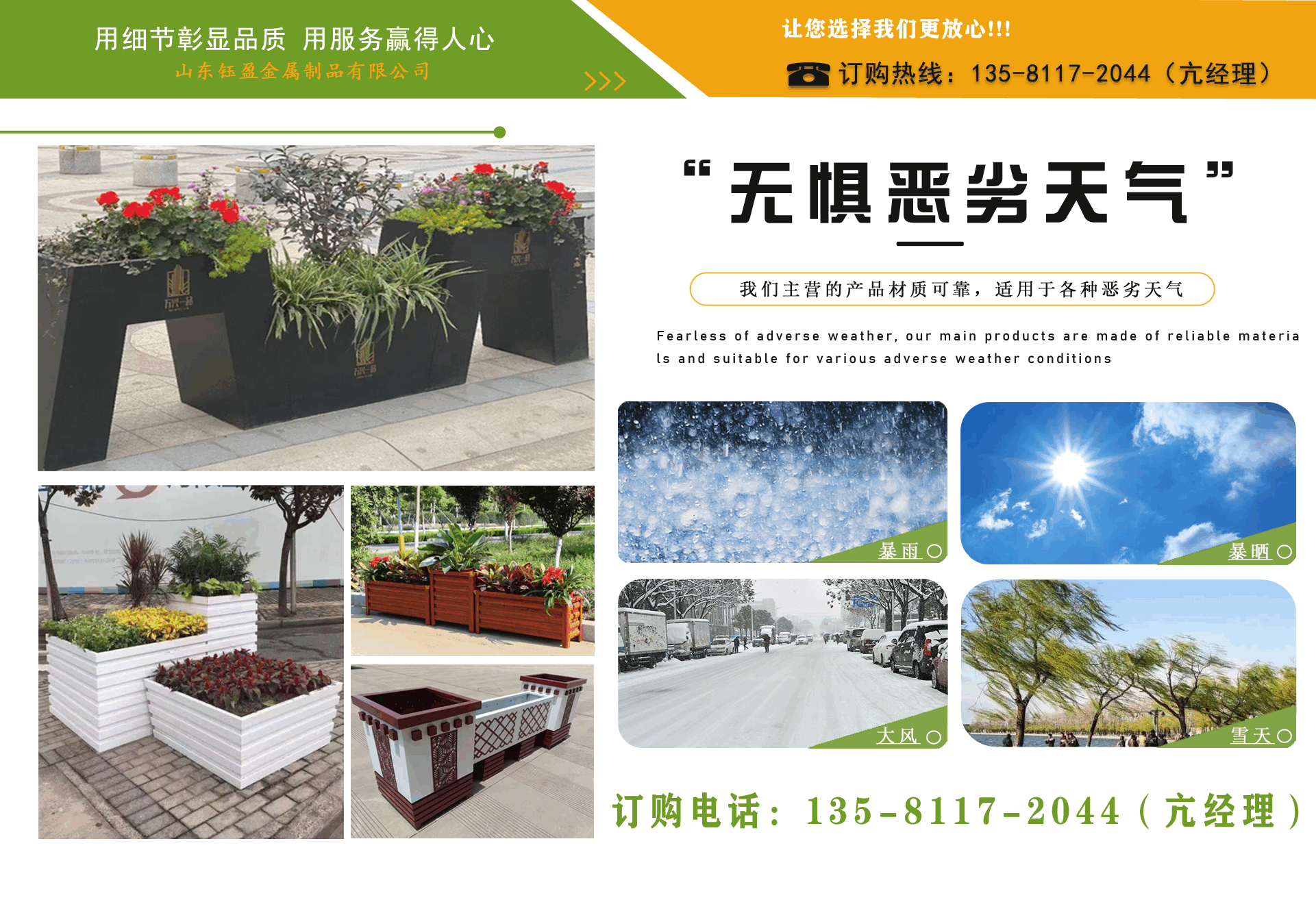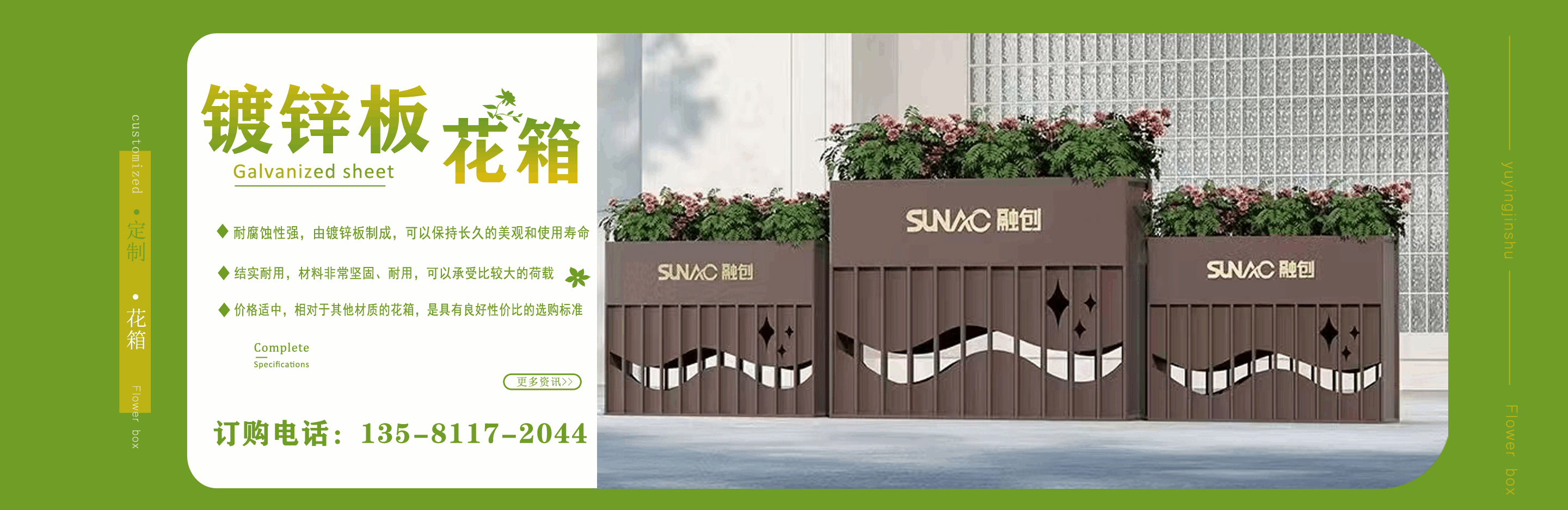 山東鈺盈金屬制品有限公司主營鍍鋅板花箱,道路隔斷花箱,定制花箱,戶外道路花箱,花箱座椅等產品,產品結構合理、性能優(yōu)良,具有強度高、耐腐蝕、抗老化、隔熱隔音、節(jié)約能源、外形美觀、使用壽命長等優(yōu)點,深受國內外客戶認可?! ∥覀兏鶕蛻羲诔鞘械奈幕卣?,制造出符合當地城市文化氣息的自然立體、觀賞性強的花箱產品成為城市里一道靚麗的風景線。 公司實行誠實、公正、守信、價格合理、平等互利。 公司憑借雄厚經驗實力,恪守誠信為本的原則,得到了眾多客戶的信賴,并在業(yè)界獲得良好的口碑。建立了穩(wěn)固的合作關系,隨著業(yè)務的不斷發(fā)展和壯大,合作伙伴的范圍也在不斷擴大。我們熱情盼望與您的合作,為社會的可持續(xù)發(fā)展獻上一份努力。...